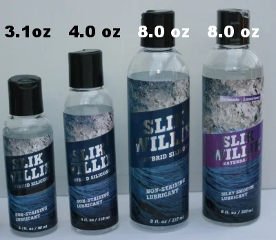 We got Slik Willie Hybrid Personal Lubricant in a 3.1oz (TSA approved travel size), 4oz and 8oz bottle, and Slik Willie Waterbased Personal Lubricant in an 8oz bottle.